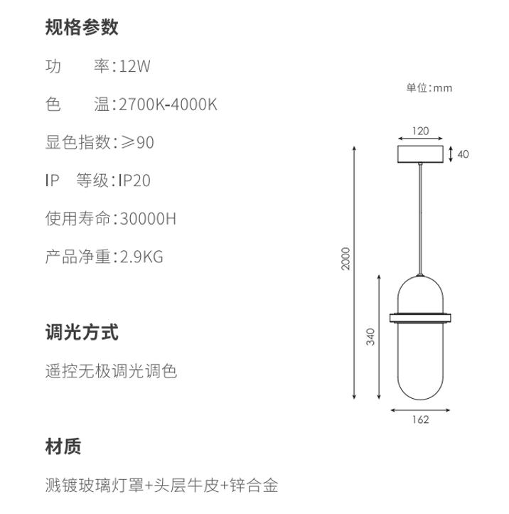美时吊灯灵感源自早晨的光线,,穿透云雾渺渺的大气层洒到地上。。。美时外层的玻璃自上而下从深色到透明的渐变镀层还原了这一情境,,光透过双层玻璃形成丰富的折射效果,,一如破晓时的光线充满朝气,,,,采用上下两路光组合,,,下路光直出提供主要光线,,,,上路光提供氛围光。。。。上路光在手工吹制玻璃的不规则壁厚折射下,,,,呈现了极其丰富的变化,,,采用头层牛皮作为一个点缀,,缓冲了玻璃与金属带来的冰冷和生硬的感觉,,,,取得了视觉的平衡。。。